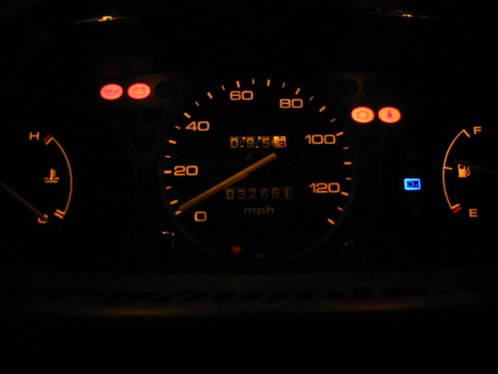 | View of painted interior from driver's side prospective | Night time shot of dash highlighting amber lit color of gauges and blue "D4" light |